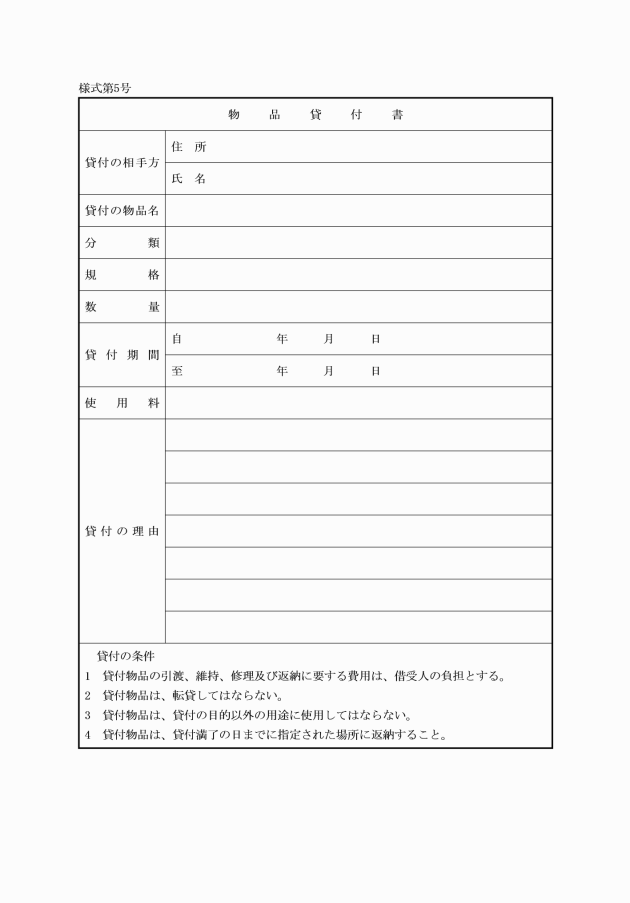 第10条 特別の事由により物品を貸し付けようとするときは、課長等は、物品貸付書(様式第5号)により決裁を受け、貸し付けなければならない。