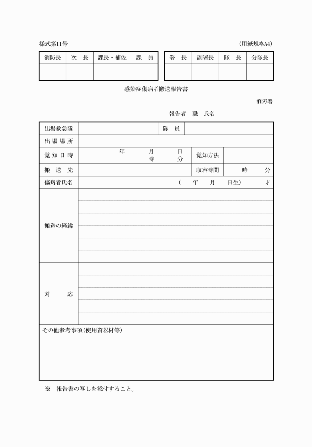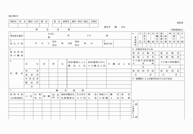 第27条 救急隊長及び分隊長は、救急業務のため出場したときは、常に通信指令課と連絡を密にし、帰署後すみやかに業務処理の概況を上司に報告するとともに長崎県版救急活動記録票兼出場報告書により署長に報告するものとする。